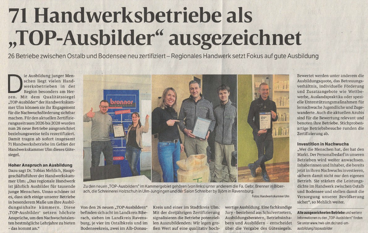 Die Handwerkskammer Ulm hat uns für den Zeitraum 2026 – 2028 als TOP-Ausbilder ausgezeichnet. Das Zertifikat ist eine Bestätigung unserer Hingabe und unseres Engagements für die Ausbildung junger Talente in unserem Handwerk.